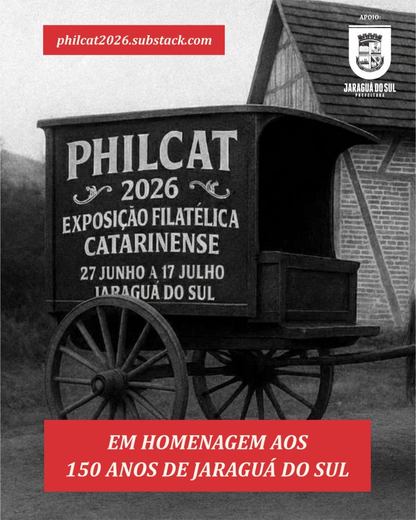 A filatelia e a história têm um encontro marcado! Entre 27 de junho e 17 de julho de 2026, Jaraguá do Sul sediará a PHILCAT 2026 – 11ª Exposição Filatélica Catarinense, em homenagem aos 150 anos da cidade. Exponha, participe, visite! Saiba mais e acompanhe as novidades pelo site oficial. Se não abrir acesse: https://philcat2026.substack.com